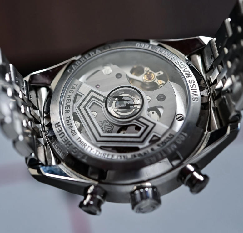 The watch is powered by the top clone TAG Heuer watches Calibre TH20-00, the brand’s in-house column-wheel automatic chronograph with vertical clutch and an 80-hour power reserve. It operates at 28,800 vibrations/hour. The movement is revealed through the sapphire caseback; the Fragment lightning-bolt emblem appears again. The rotor, an angular, shield-shaped form, is accented with black detailing to echo the monochrome dial.