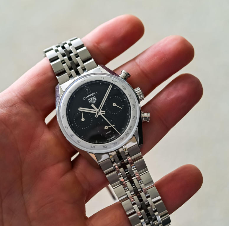 In hand, the 39mm stainless steel case immediately reveals the cool and stylish Glassbox concept. There’s no external bezel, as the highly domed sapphire crystal rises fluidly from the case edge and merges into the tachymeter flange beneath. From the side, it feels like a single continuous curve of steel and glass, an unbroken silhouette. The angular lugs are sharp and faceted, extending cleanly from the midcase in true Carrera fashion. Measuring 13.9mm thick, it’s not the slimmest chronograph, but the proportions are balanced, and the crystal’s shape visually lightens the best fake watches UK.